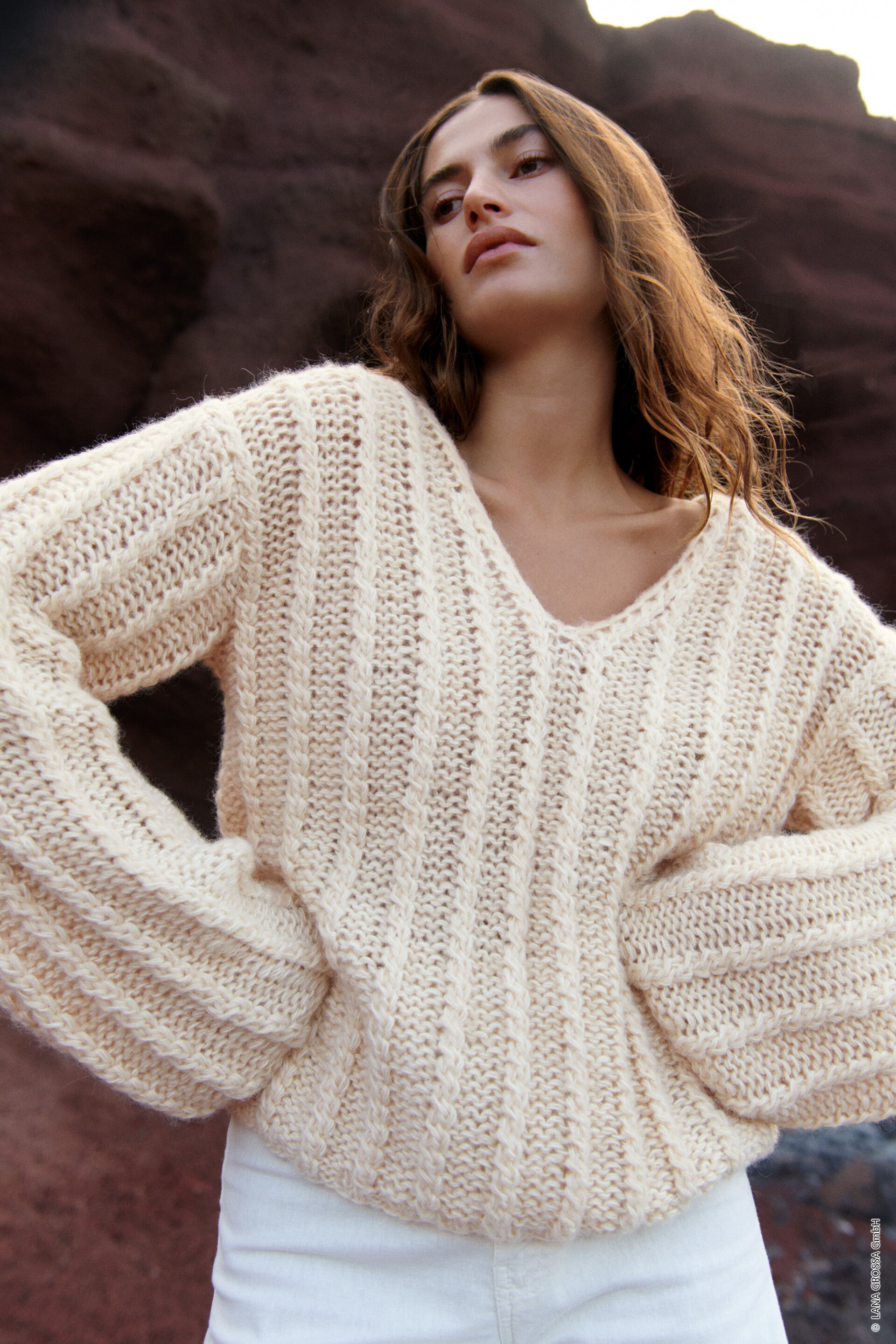 Dit luxueuze innovatieve garen creëert een subtiele knobbelige gebreide textuur en is zeer zacht voor de huid,