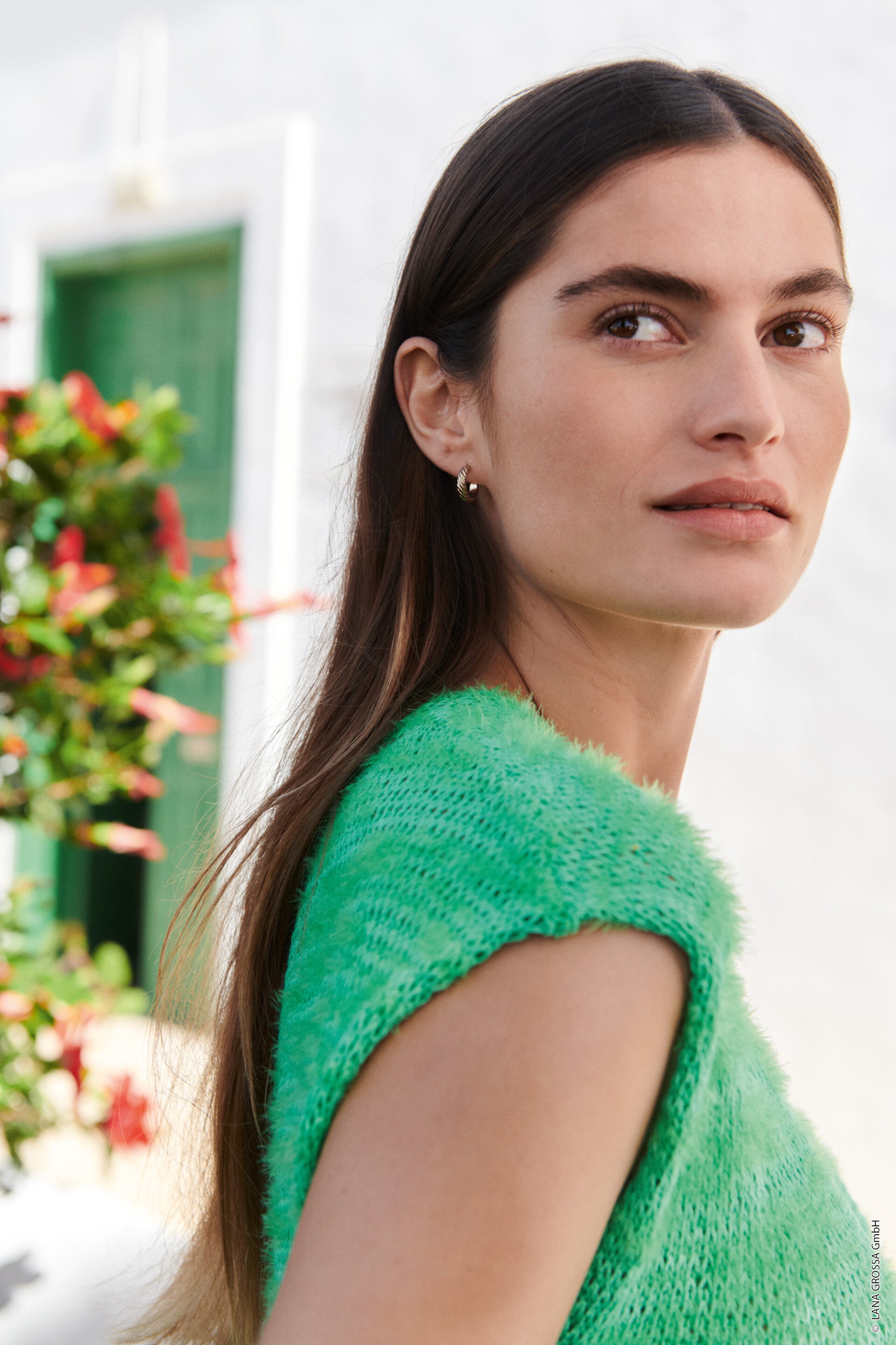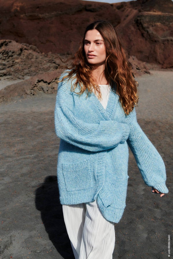 Het resultaat is een badstofachtige gebreide textuur die ons subtiel meeneemt naar de relaxte midzomerlooks van de jaren zeventig.