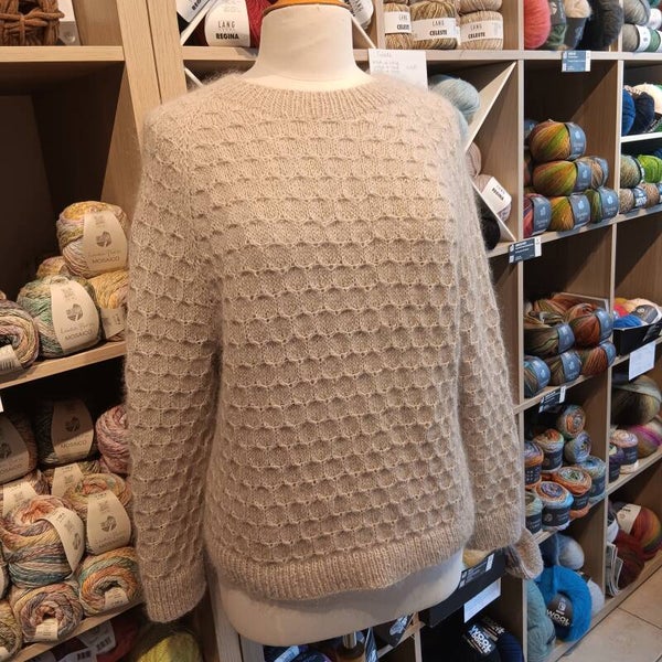 Deze trui wordt gebreid met de ecopuno & setasuri of silkhair samen.
