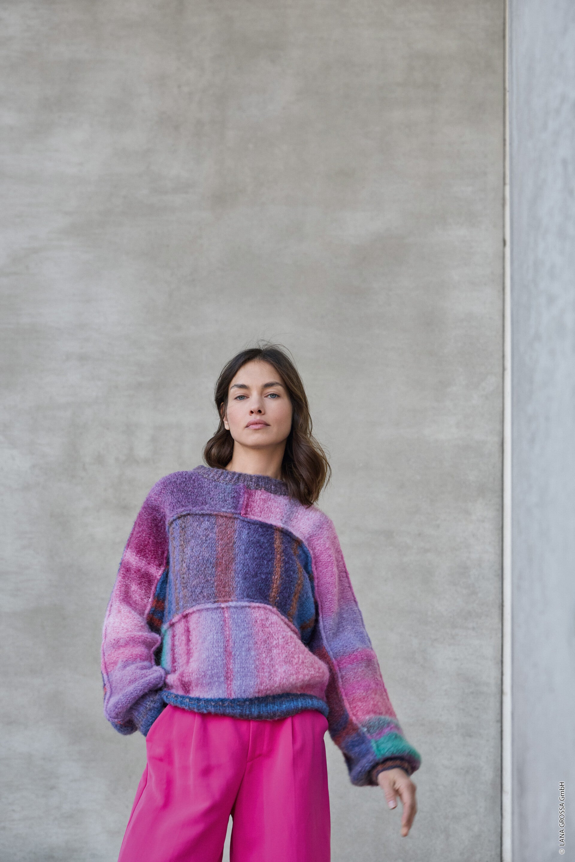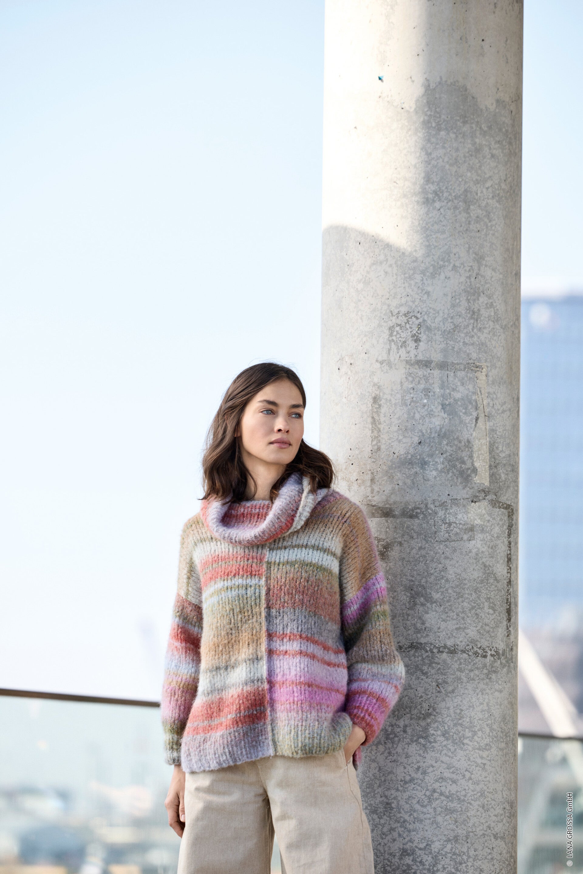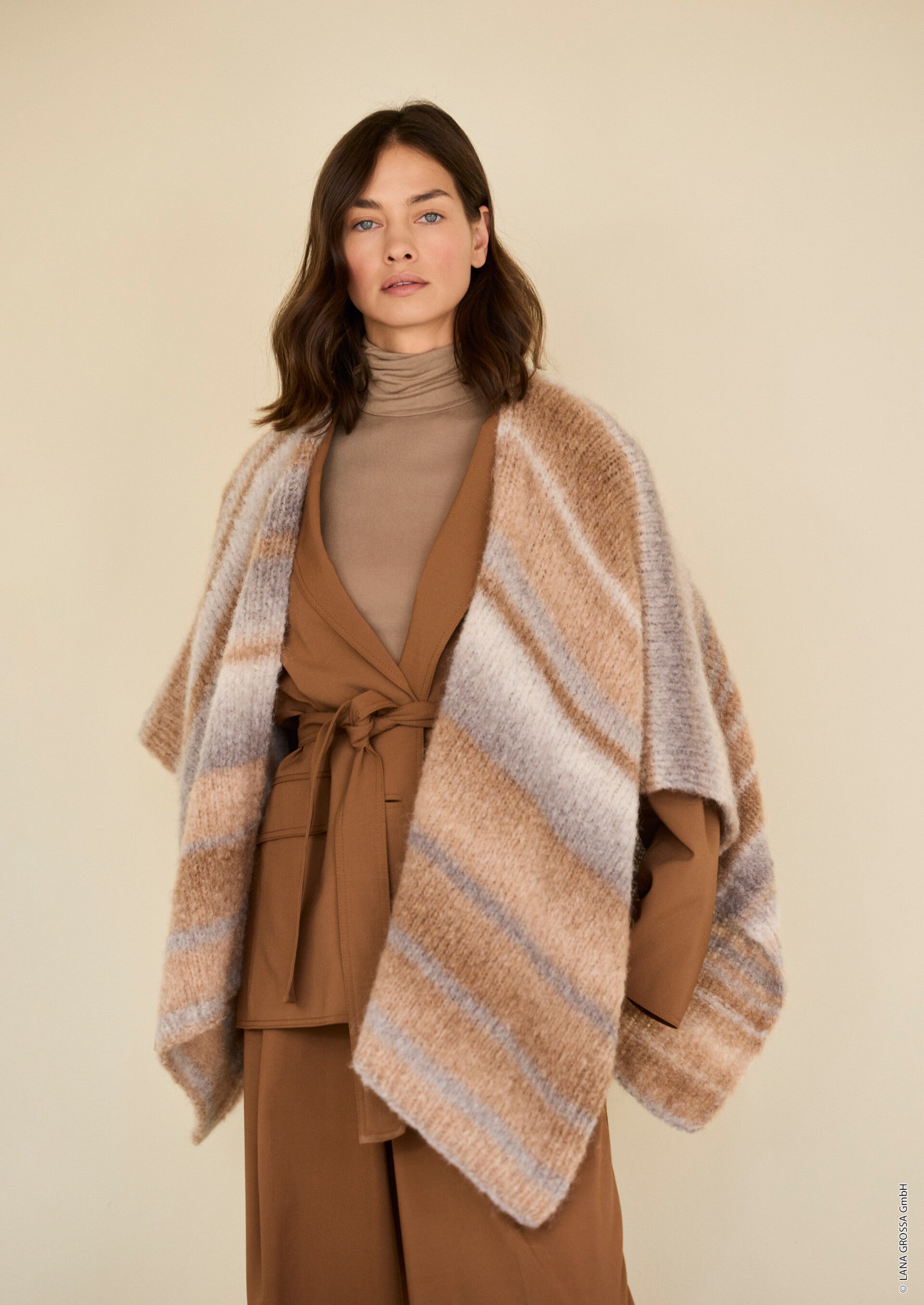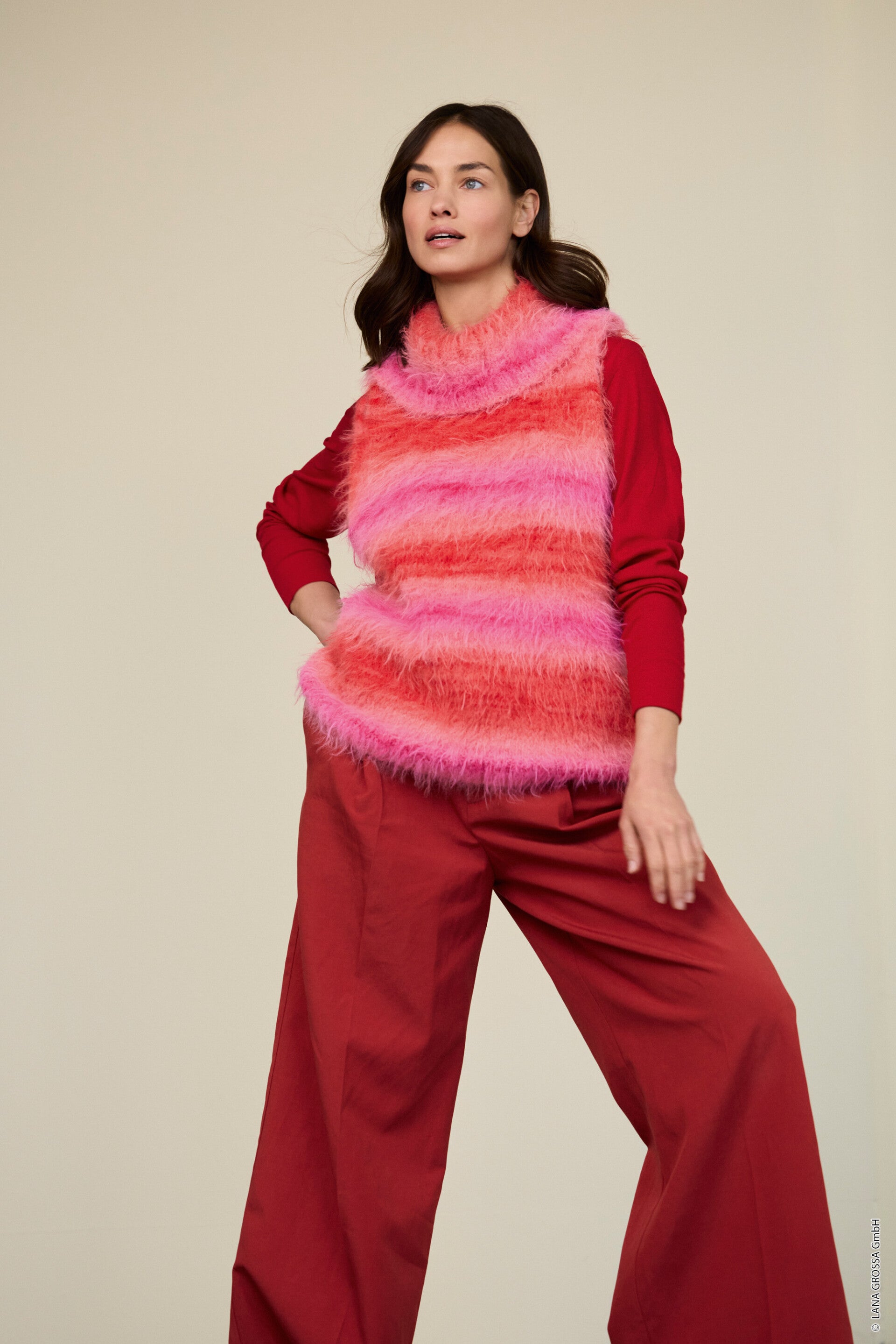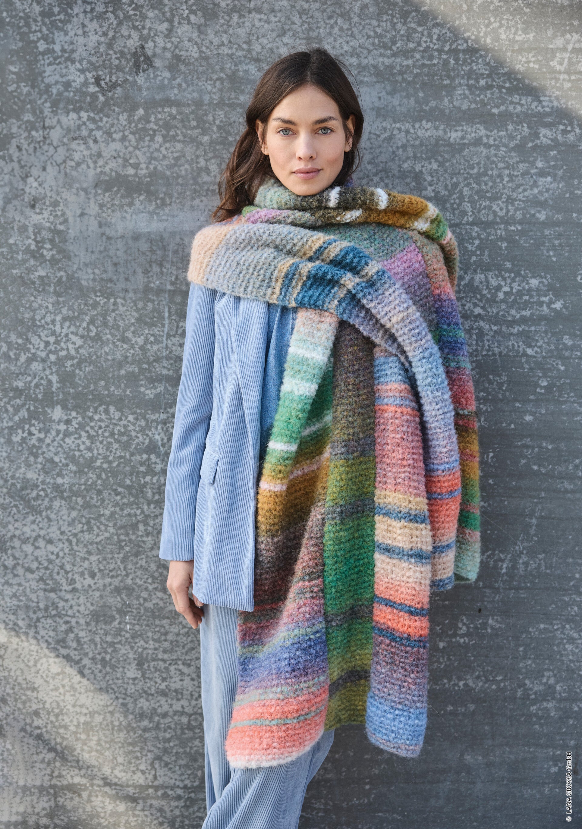 Dit losjes gedraaide garen, bekend om zijn kenmerkende dramatische franje-effect, heeft nu ook gedurfde royale strepen.