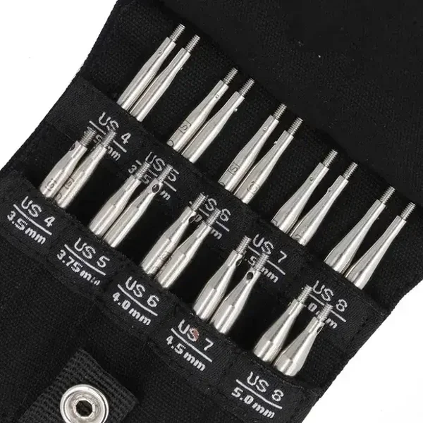 De set is op te bergen in een etui dat ruimte biedt aan de verwisselbare breinaalden en kabels.